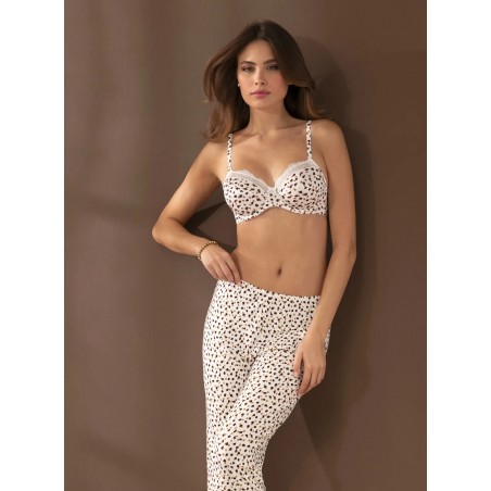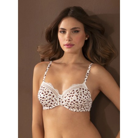 Soutien-gorge souple à armature tout en maille imprimée. Incrustation de dentelle barbe au décolleté. Le bas de basque est enrichi d'une bordure fantaisie. Nœud à l'entregorge. Bretelles devant recouvertes de maille imprimée.