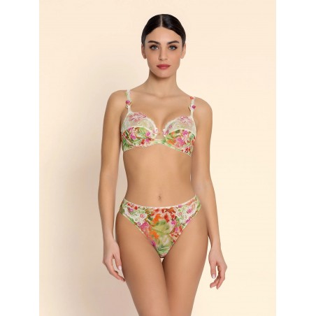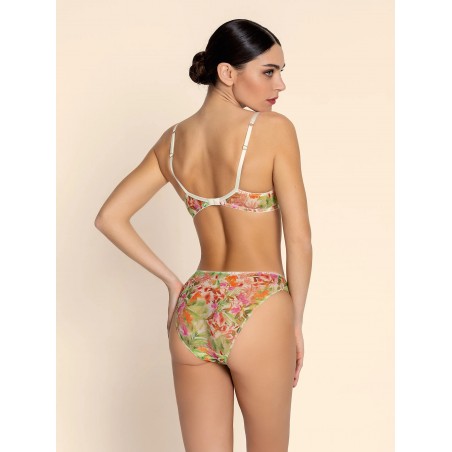 Soutien-gorge souple à armature, bonnets emboîtants. Porter naturel et confortable. Bas bonnet et basque en tulle imprimé. Haut bonnet festonné brodé multicolore coordonné à l'imprimé. Entre gorge avec empiècement tulle transparent réhaussé par un bijou doré et un strass orange.Les motifs bretelles en guipure viennent s'enrouler autour des bretelles satinées .