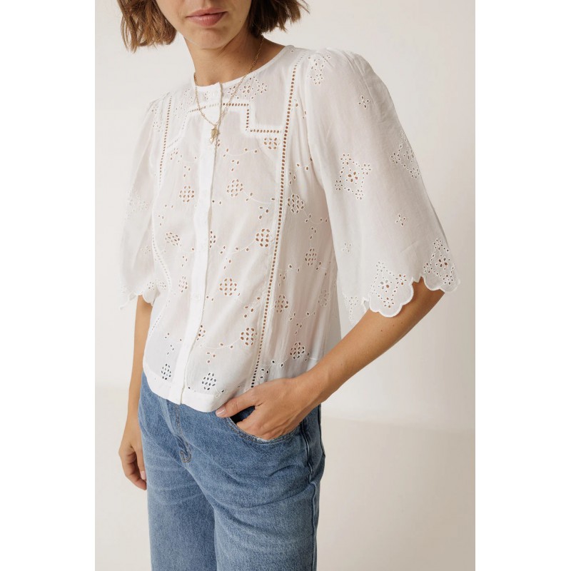Une chemise romantique avec manches 3/4 et finitions festionnées ondulées. Elle peut être combinée avec la jupe de la même série pour créer un effet robe, ou avec n'importe lequel de nos pantalons denim pour un look plus décontracté.
