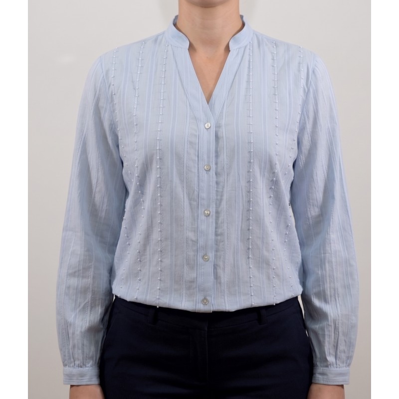 Cette blouse comporte une encolure féminine en V et des manches longues avec poignet ouvert boutonné sur des emmanchures arrondies. Cette pièce présente un volume droit. Elle est confectionnée sur un support léger et rayé très agréable à porter en pur coton. Elle arbore sur sa partie avant différentes bandes de perles raffinées.