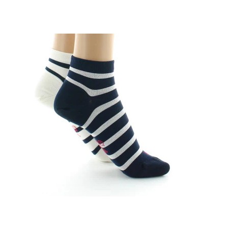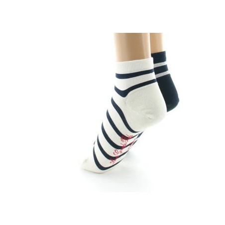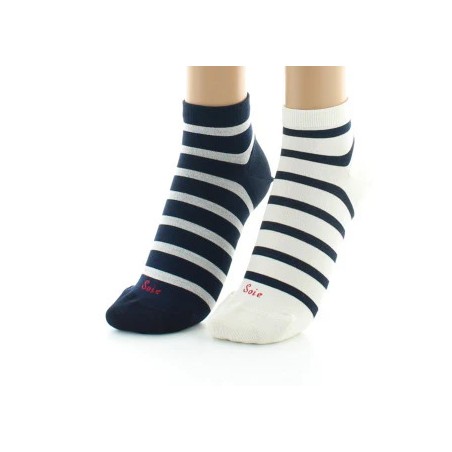 Originales de part la rayure asymétrique, l'écru est accordé à un bleu marine dark navy, rendant l'ensemble très chic. Le mot Soie est inscrit en bout de pied.