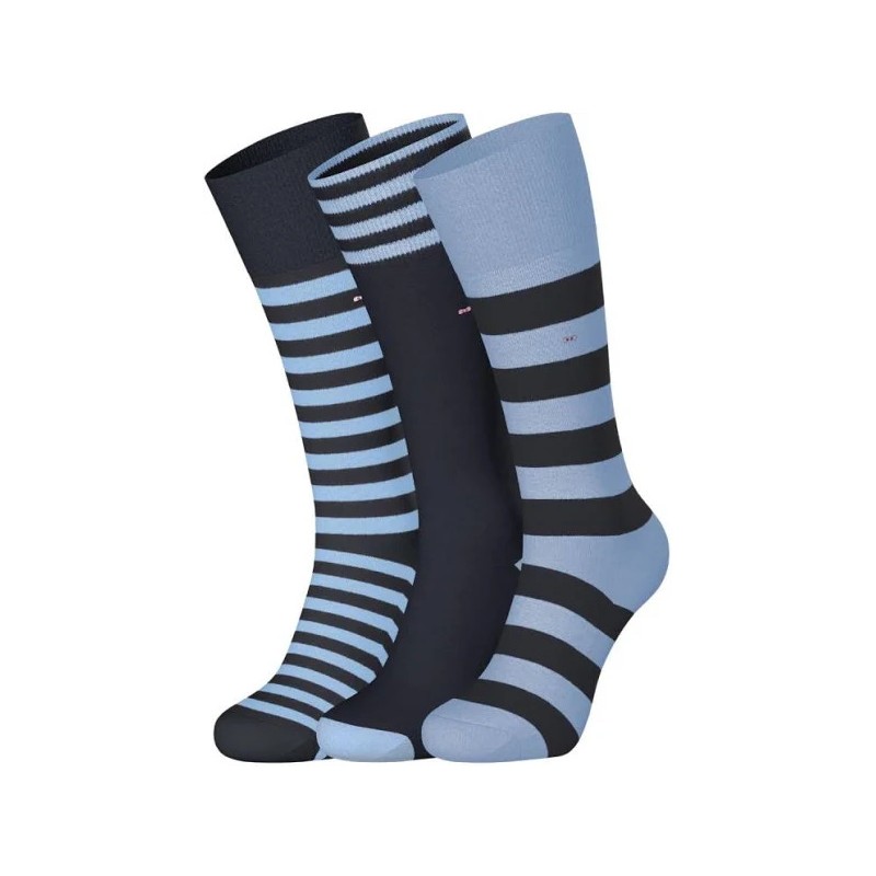 Pack de 3 paires de chaussettes à rayures épaisses bleu marine, sur fond bleu ciel. Chaussettes montantes. Pointes et talons renforcés. Partie haute de la chaussette resserrée pour un maintien optimal.
