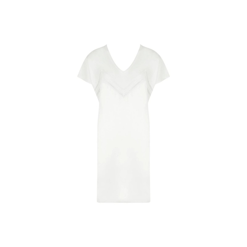 Nuisette robe légèrement évasée sur le bas. Longueur dessus genou. Nuisette tunique en maille unie avec incrustation d'un galon dentelle sur le devant.