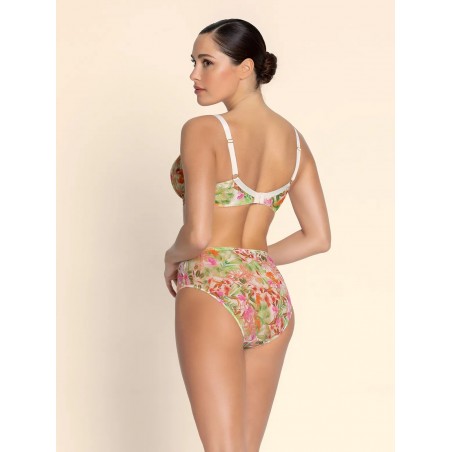 Gainant sur le devant, effet ventre plat. Slip emboîtant dans le dos et large sur les côtés. Maximum de confort au porter. Devant et dos en tulle imprimé, empiècements brodés incrustés sur les côtés devant. Milieu devant doublé de tulle.