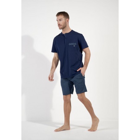 Le pyjama homme court CAIRO en 100% coton offre une douceur naturelle, une excellente respirabilité et un confort idéal. Son t-shirt col tunisien et son short à motif art déco allient style et bien-être au quotidien.