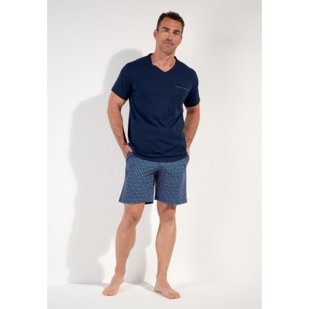 Ce pyjama court pour homme est réalisé en 100% coton. Doux et respirant, l'ensemble 2 pièces, qui comporte un short à imprimé géométrique lumineux et un t-shirt uni marine avec poche poitrine, vous assure un confort stylé.