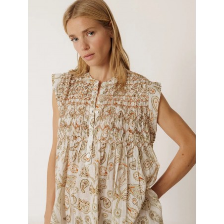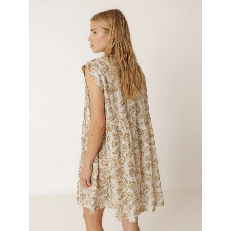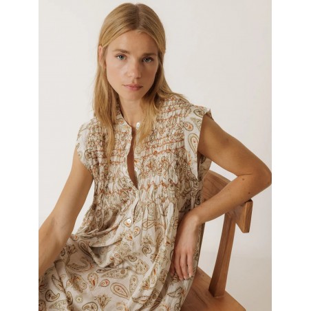 Robe oversize à épaules ajustées, taille smockée et fermeture boutonnée au milieu du dos. Tissu léger en coton biologique et coupe décontractée.