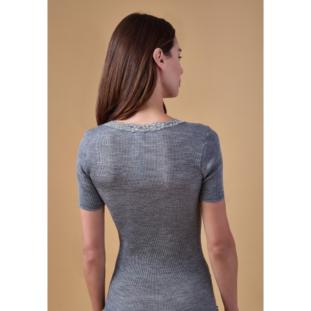 Pull à manches mi-longues en laine mérinos et soie, avec encolure en V. Fini avec de la douce dentelle Fraly, la haute qualité des fils et de l'emballage le rend unique. La laine de soie possède des propriétés antibactériennes et thermorégulatrices, offrant un confort maximal comme un câlin chaleureux.