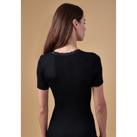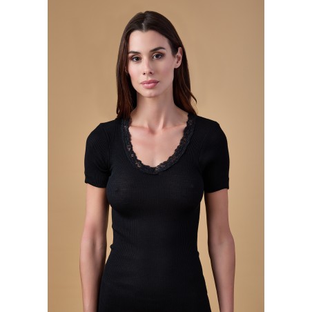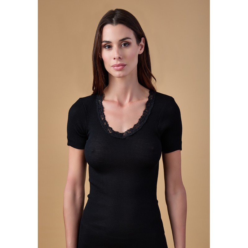 Pull à manches mi-longues en laine mérinos et soie, avec encolure en V. Fini avec de la douce dentelle Fraly, la haute qualité des fils et de l'emballage le rend unique. La laine de soie possède des propriétés antibactériennes et thermorégulatrices, offrant un confort maximal comme un câlin chaleureux.