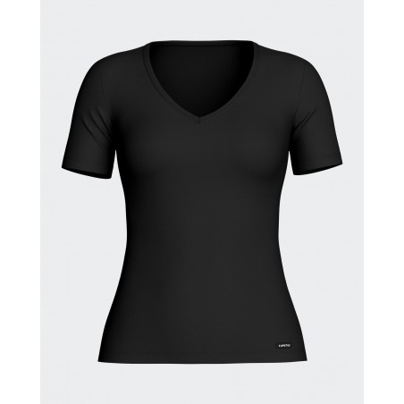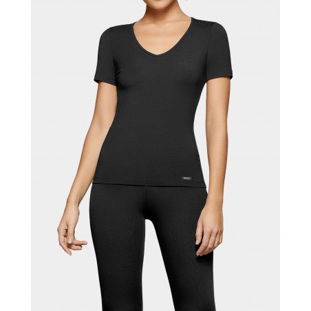 T-shirt manches courtes thermique col V de la ligne Thermo. Isole la température du corps, réduisant les dangers du refroidissement excessif provoqué par les basses températures. Sans étiquette intérieure. Fabriqué au Portugal.