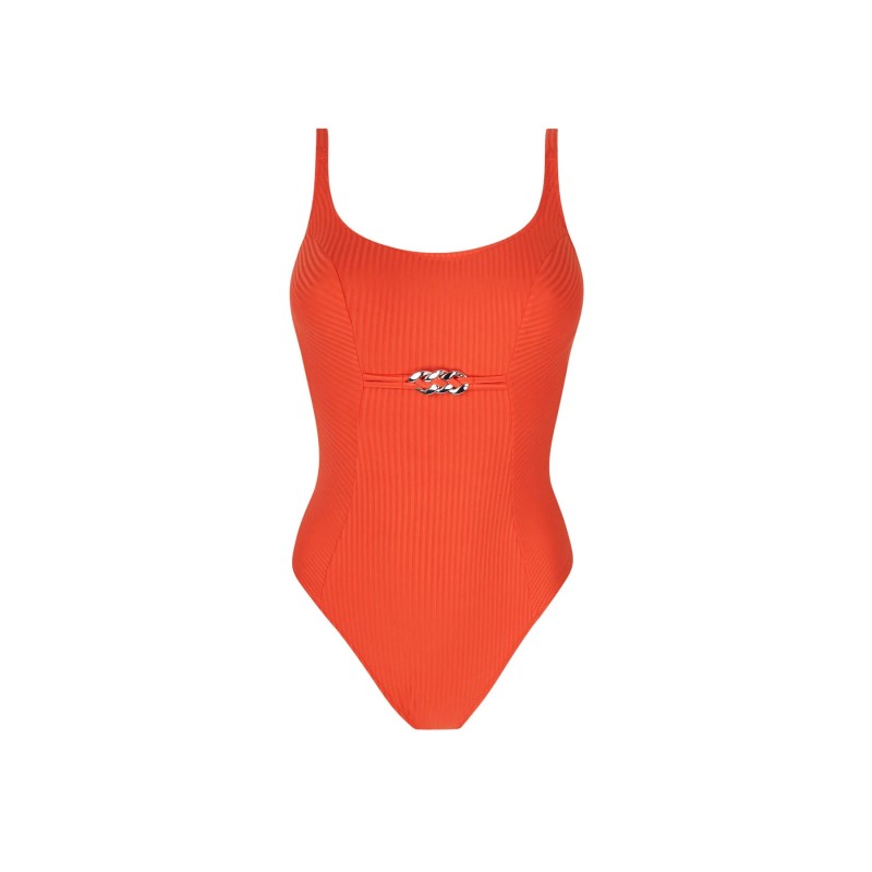 Un maillot de bain élégant d'Antigel de couleur orange classique et de structure côtelée. Le maillot de bain est doté d'armatures pour un très bon maintien. Il n'est pas rembourré sur les bonnets pour une jolie silhouette et sèche rapidement. Bretelles réglables.